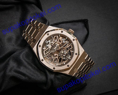 仕様:時 分表示、フライング トゥールビヨン、反射防止加工サファイアクリスタルとケースバック、オープンワークダイヤル、サンドゴールドカラーのインナーベゼル、蓄光処理を施したホワイトゴールドのアプライドアワーマーカーとロイヤル オーク針